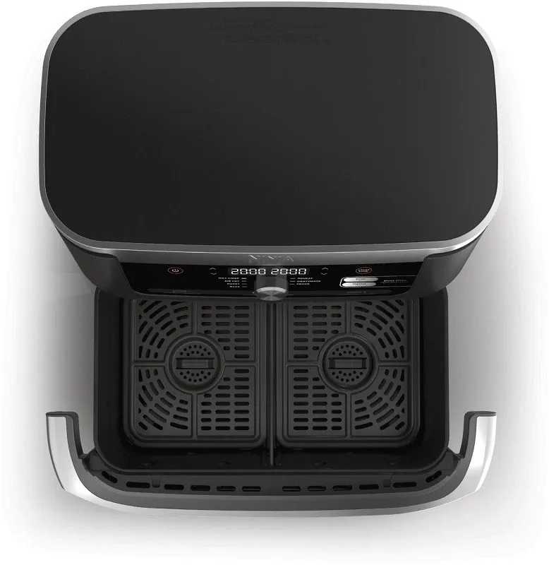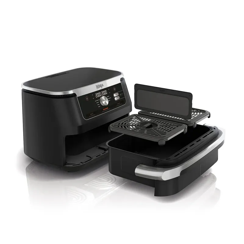 نینجا در طراحی محصولات خود همواره ترکیبی از استحکام، زیبایی مدرن و کاربری آسان را مد نظر قرار می‌دهد و این فلسفه در مدل AF500 نیز به وضوح قابل مشاهده است. بدنه دستگاه از پلاستیک فشرده با کیفیت بالا و به رنگ مشکی مات با جزئیات نقره‌ای ساخته شده که علاوه بر مقاومت در برابر حرارت و خط و خش، ظاهری شیک و حرفه‌ای به آن می‌بخشد. پنل کنترل در قسمت جلویی دستگاه قرار گرفته و شامل یک نمایشگر دیجیتال واضح، دکمه‌های لمسی برای انتخاب برنامه‌های پخت و یک کنترلر چرخشی (Dial) برای تنظیم دقیق زمان و دما است. این رابط کاربری بصری، کار با دستگاه را حتی برای کاربران مبتدی بسیار ساده می‌کند. اما شاهکار طراحی سرخ کن نینجا دوقلو AF500 در محفظه پخت آن نهفته است؛ یک کشوی بزرگ با ظرفیت ۱۰.۴ لیتر که توسط یک جداکننده متحرک به دو سبد ۵.۲ لیتری مستقل تقسیم می‌شود. این طراحی هوشمندانه به کاربر اجازه می‌دهد تا بسته به نیاز خود، از دو منطقه پخت مجزا یا یک فضای پخت عظیم و یکپارچه استفاده کند.