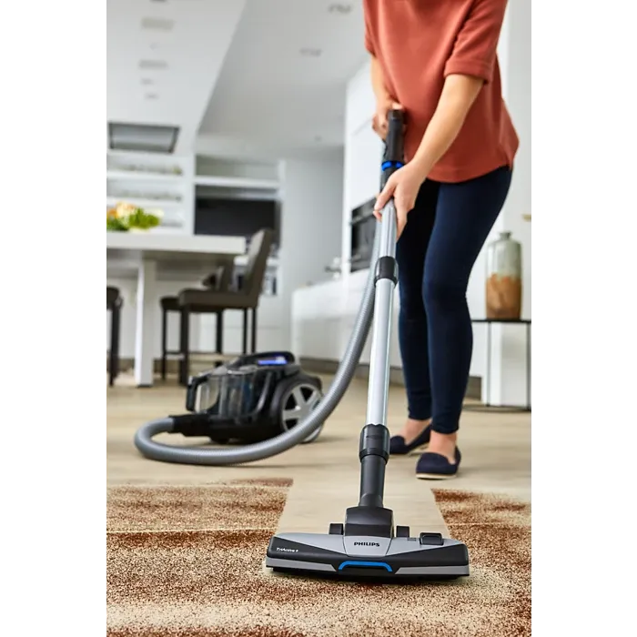 آنچه که این مدل را از بسیاری از رقبا متمایز میکند، بهرهگیری از فناوری انحصاری سیستم مکش PowerCyclone 8 است که با ایجاد یک نیروی گریز از مرکز فوقالعاده قدرتمند در محفظه استوانهای، گرد و غبار را با سرعتی خیرهکننده از هوا جدا کرده و عملکردی پایدار را حتی در زمان پر شدن مخزن تضمین میکند. این فناوری موجب میشود تا جریان هوا با کمترین مقاومت عبور کرده و افت مکشی که در جاروبرقیهای کیسهدار قدیمی شایع بود، در اینجا به حداقل برسد. پارویی اصلی دستگاه با تکنولوژی TriActive+ طراحی شده است که به صورت همزمان سه عمل نظافتی را انجام میدهد: باز کردن پرزهای فرش برای مکش عمقی، جمعآوری زبالههای درشت از دهانه جلویی و جمعآوری گرد و غبار از کنارهها، که این ویژگی باعث میشود جارو برقی فیلیپس fc9747 در هر بار رفت و برگشت، سطحی وسیعتر و تمیزتر را به ارمغان بیاورد. وجود سریهای متنوع برای نظافت درزها، مبلمان و سطوح حساس پارکت، این دستگاه را به یک ابزار همهکاره تبدیل کرده که تمامی نیازهای نظافتی یک خانه بزرگ را بدون نیاز به تعویض مکرر ابزار، پوشش میدهد.